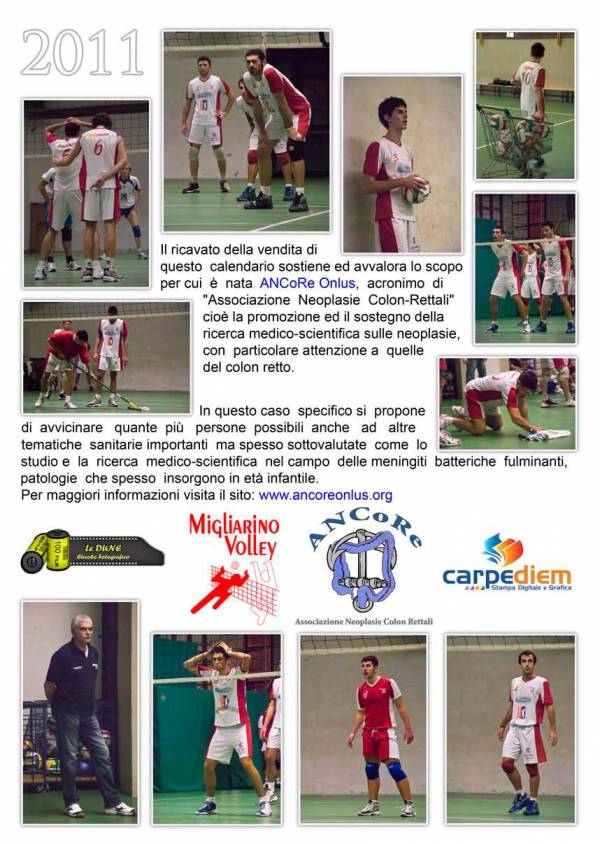 La società Migliarino Volley, in collaborazione con il Circolo Fotografico Le Dune di Migliarino e con il Patrocinio del Comune di Vecchiano, ha realizzato un calendario, con protagonisti gli atleti della prima squadra, con gli incassi da devolvere in beneficenza. A fruire del ricavato di questa vendita sarà l´Associazione AncoRe (Associazione Neoplasie Colon-Rettali), che si occupa della di promozione e sostegno della ricerca medico-scientifica sulle neoplasie, con particolari attenzioni a quelle del colon retto. In questo caso specifico si propone di avvicinare quante più persone possibili ad altre tematiche sanitarie importanti ma spesso sottovalutate come lo studio e la ricerca medico-scientifica nel campo delle meningiti batteriche fulminanti, patologie che spesso insorgono in età infantile.